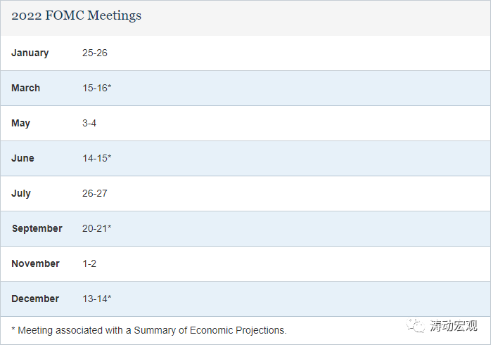 2022年美聯儲的8次議息時間分別為1月25-26日、3月15-16日、5月3-4日、6月14-15、7月26-27日、9月20-21日、11月1-2日以及12月13-14日。