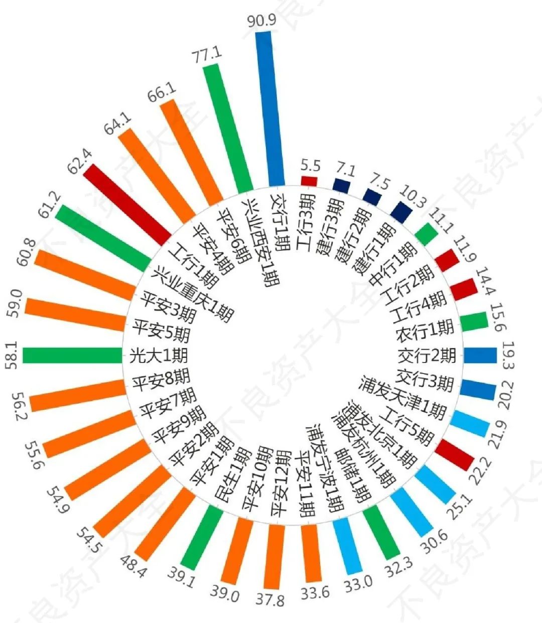 從已公告的34期銀行個貸不良資產(chǎn)來看,建行的三期平均逾期月數(shù)(按未償本息加權(quán)平均,下同)只有七個半月,即便在傳統(tǒng)清收領(lǐng)域,也不算長賬齡資產(chǎn)。而平均逾期月數(shù)最長的為平安銀行,接近五年。此外,工商銀行為41.6個月,交通銀行為31.9個月,浦發(fā)銀行為27.1個月,其余銀行則為1至5年不等。其中單期平均逾期月數(shù)最長的為交行1期的90.9個月,賬齡超過七年半;最短的為工行3期不足半年。就銀行個貸不良來看,賬齡分布比較全面,客觀上基本照顧到了不同賬齡專長的資產(chǎn)管理公司或處置機構(gòu)。