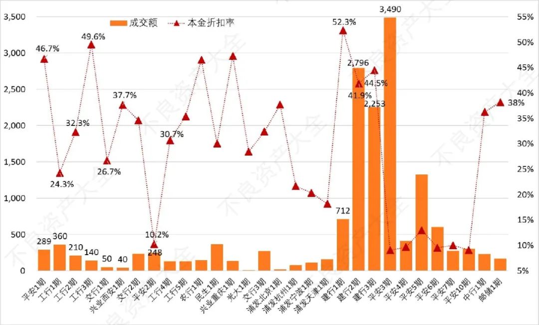 成交額固然是資產(chǎn)管理公司競價的時候考慮的重要因素之一,但成交額主要受預算限制,真正體現(xiàn)不良資產(chǎn)價格實質(zhì)上是本金折扣率。從已經(jīng)公布成交情況的若干期不良資產(chǎn)來看,平安銀行的本金折扣率整體偏低,建設(shè)銀行的正好相反,這也與各銀行出讓的不良資產(chǎn)總體情況相吻合。各期中本金折扣率最高的為建行1期,其也是各期中質(zhì)量最高的不良資產(chǎn)之一。