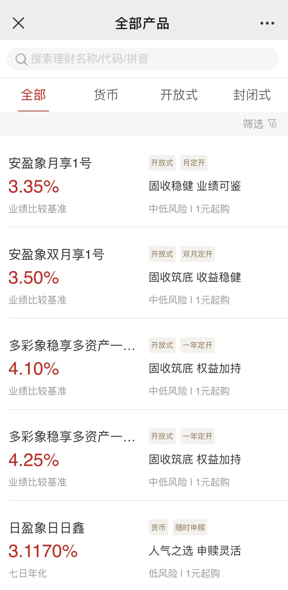 其中,貨幣產品即日盈象日日新,1元起購,低風險,隨時申贖,快速轉出2小時內到賬;開放式產品包括安盈象、多彩象、百寶象等系列,期限1個月到1年不等,為中低風險的固定收益類產品;封閉式產品期限為兩年,包括安盈象固收穩健兩年與安盈象強債穩健兩年,同樣為中低風險產品。