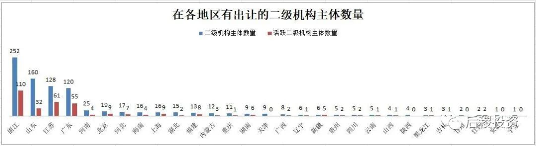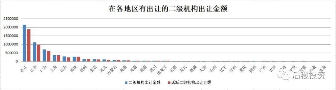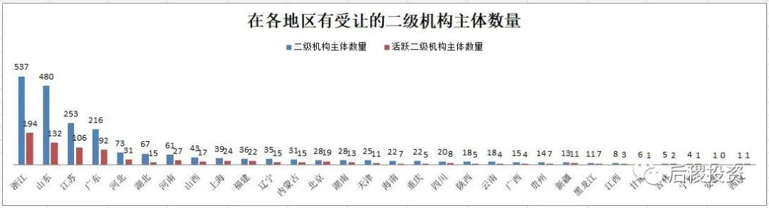 從主體數(shù)量上看,二級機(jī)構(gòu)市場參與主體集中在東部地區(qū),其中浙江、江蘇和廣東的活躍二級機(jī)構(gòu)占總二級機(jī)構(gòu)比例均約為50%,而山東的活躍二級機(jī)構(gòu)占比約為20%。而其他地區(qū)有出讓記錄的二級機(jī)構(gòu)主體數(shù)量零星可數(shù),這一方面是因?yàn)橄啾葨|部省份,二級機(jī)構(gòu)參與市場成交確實(shí)相對較少,另一方面則是因?yàn)槎墮C(jī)構(gòu)轉(zhuǎn)讓大部分,特別是民營機(jī)構(gòu)并不需要走公告流程,故數(shù)據(jù)上難以體現(xiàn)。