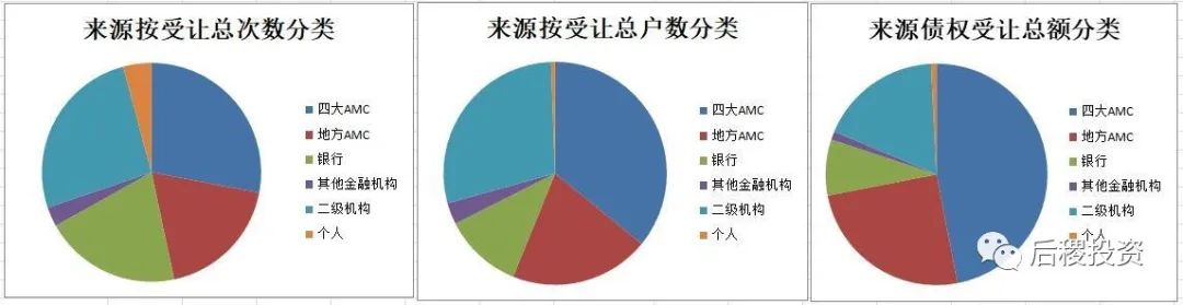 根據(jù)受讓來源分析,無論從受讓次數(shù)、戶數(shù)還是金額上看,四大全國AMC都是二級機(jī)構(gòu)債權(quán)受讓的最主要來源,地方AMC和其他二級機(jī)構(gòu)的比例則相當(dāng),而直接從銀行受讓債權(quán)也占了一小部分。四大AMC扎根行業(yè)較久,合作的二級機(jī)構(gòu)較地方AMC更多屬正常現(xiàn)象,但同樣可以看出地方AMC和二級機(jī)構(gòu)的快速發(fā)展。