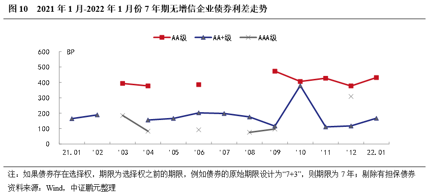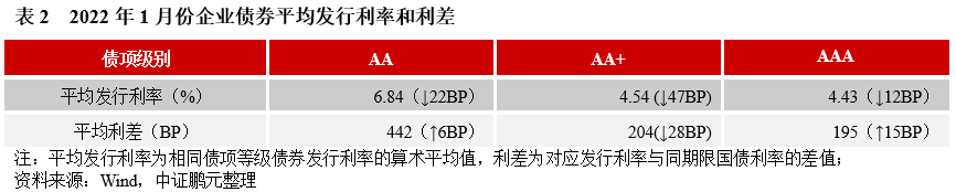 2022年1月,企業(yè)債券最高發(fā)行利率為8.00%,較上月上行50BP;最低發(fā)行利率為2.94%,較上月下行24BP。從債券級別來看,與上月相比,本月各級別企業(yè)債平均發(fā)行利均下行,其中AA+級下行47BP,幅度最大;平均發(fā)行利差方面,AA+級企業(yè)債平均發(fā)行利差收窄28BP,AA級和AAA級分別擴大6BP和15BP。