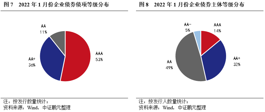 2022年1月發(fā)行的企業(yè)債債項信用等級以AA+級為主,AA+及以上的高級別品種數(shù)量占比93%,較上月下降0.3個百分點。