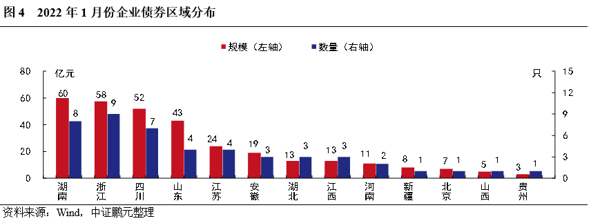2022年1月,共有13個省份發(fā)行了企業(yè)債券。其中,湖南和浙江分別發(fā)行59.90和57.50億元,規(guī)模高于其他省份,其次,四川和山東分別發(fā)行51.90和43億元。與上年同期相比,本月除湖北和山東發(fā)行規(guī)模出現(xiàn)下滑,其余省份均出現(xiàn)增長,其中,四川同比增長419%,漲幅最大,其次是湖南,增長344%。此外,山西發(fā)行5億元企業(yè)債券,為2021年來首次發(fā)行,發(fā)行主體為“山西建設(shè)投資集團有限公司”,主體評級AAA。