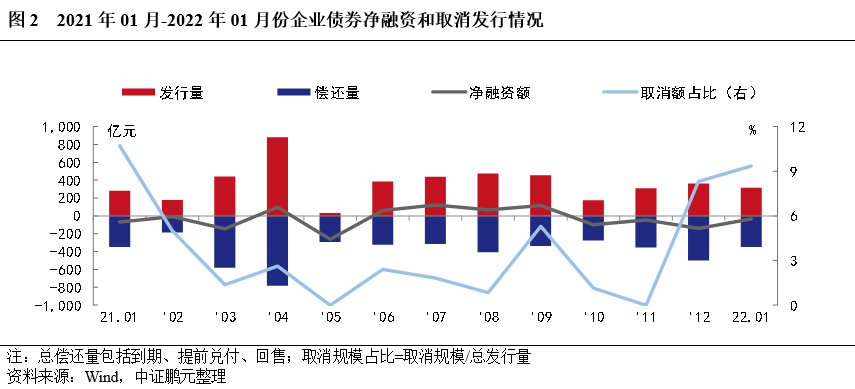 從凈融資情況來看,1月企業(yè)債券總發(fā)行規(guī)模315.30億元,總償還規(guī)模349.68億元,本月表現(xiàn)為凈償還34.38億元,上年同期為凈償還69.01億元。此外,2022年1月有2只企業(yè)債券取消發(fā)行,原計劃發(fā)行規(guī)模29.50億元,取消發(fā)行規(guī)模占比9.4%,為近一年峰值。2月,企業(yè)債待償還規(guī)模116.61億元,為近一年低位。本月回售壓力不大,僅2只含權(quán)債券,債券余額26.40億元。