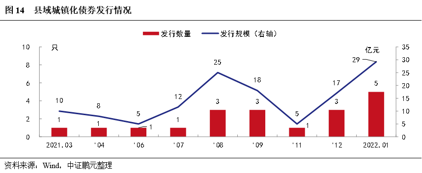 2022年1月,縣城新型城鎮(zhèn)化企業(yè)債(簡稱“縣域城鎮(zhèn)化債券”)發(fā)行5只,規(guī)模合計29.20億元,為首次發(fā)行以來的單月峰值。自2021年1月以來,本創(chuàng)新品種共發(fā)行19只,規(guī)模合計128.80億元,涉及15家發(fā)行主體。