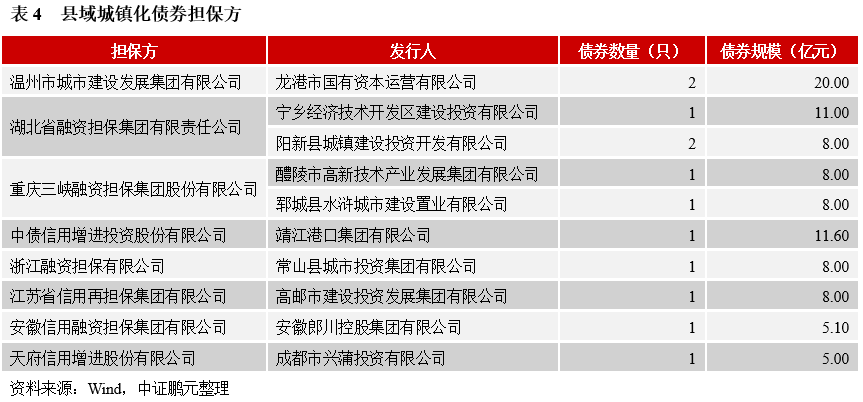 從主體級別看,AA級主體11家,AA+級主體3家,12只債券選擇增信發(fā)行,占比63%。其中,10只債券從AA增信至AAA,2只債券從AA+增信至AAA。從增信方看,擔(dān)保方共計8家,其中湖北省融資擔(dān)保集團有限責(zé)任公司和重慶三峽融資擔(dān)保集團股份有限公司分別對2家主體提供擔(dān)保,涉及省內(nèi)外。