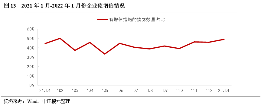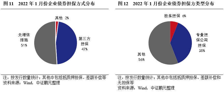 2022年1月,企業(yè)債有擔(dān)保的債券共計23只,數(shù)量占比49%,較上月上升3個百分點,主要是AA+級主體增信比例上升。分主體級別看,AA級主體選擇增信發(fā)行的債券比重為77%,較上月下降3個百分點;AA+級主體選擇增信發(fā)行的債券比重為25%,上月均未增信。從擔(dān)保方類型看,專業(yè)擔(dān)保公司依然為主體擔(dān)保主體,占比38%。