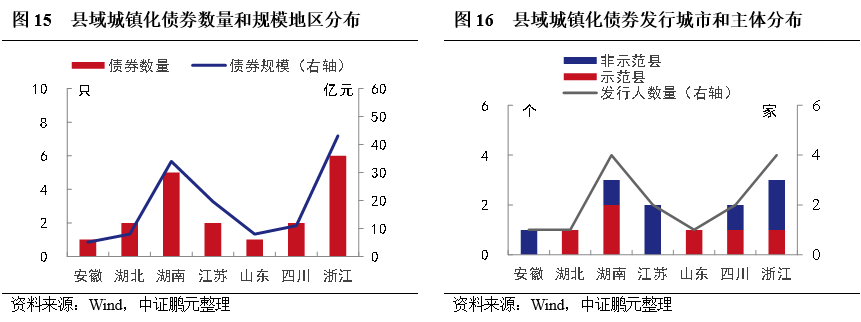 分城市看,目前有7個省份的12個城市發(fā)行過縣域城鎮(zhèn)化債券,其中,浙江和湖南為主要發(fā)行地區(qū),分別發(fā)行6只和5只,規(guī)模分別為43.10億元和34億元。分城市看,共有13個區(qū)縣參與發(fā)行,示范縣6個,占比46%。除浙江桐廬縣和瀏陽市分別有2家發(fā)行人外,其余地區(qū)均有一家。