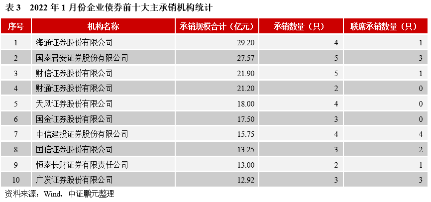 就承銷機構(gòu)而言,2022年1月共有28家機構(gòu)參與企業(yè)債券的承銷工作。海通證券承銷29.20億元,位居第一;國泰君安證券承銷27.57億元,位居第二;財信證券承銷21.90億元,位居第三。