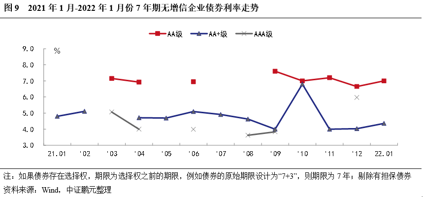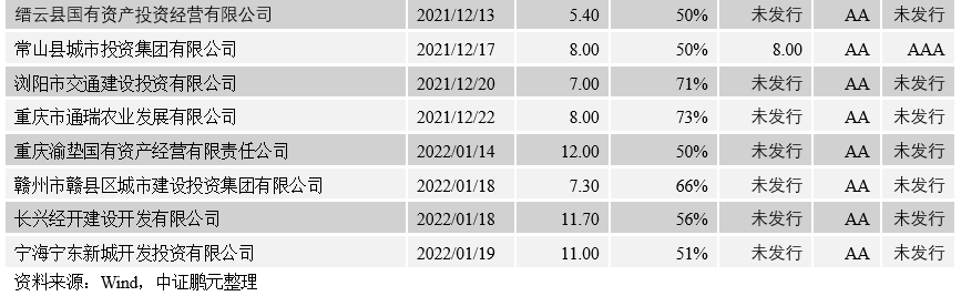 2022年1月,企業(yè)債券期限分布于7年期等期限品種。其中,7年期品種發(fā)行36只,占比77%,發(fā)行規(guī)模203.30億元,占比65%;5年期品種發(fā)行5只,占比11%,發(fā)行規(guī)模34億元,占比11%。與上月相比,5年期和7年期品種發(fā)行規(guī)模占比較上月分別下降8.7和上升9個百分點。