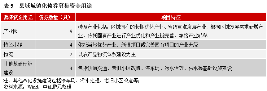 從募集資金用途看,目前主要集中在產(chǎn)業(yè)園建設(shè)和特色小鎮(zhèn)兩個領(lǐng)域,其他方面包括物流、停車場、污水處理、老舊小區(qū)改造等城市基礎(chǔ)設(shè)施建設(shè)。第一,產(chǎn)業(yè)園發(fā)展因地而異。發(fā)展較早的地區(qū)進入園區(qū)整合優(yōu)化階段,包括園區(qū)整合、數(shù)字化改造以及產(chǎn)業(yè)鏈升級、完善等。例如,“22新城債”,募集資金用于浙江省大力推動的新材料產(chǎn)業(yè),以及當(dāng)?shù)亻L期優(yōu)勢產(chǎn)業(yè)醫(yī)療器械領(lǐng)域,以及依托安防小鎮(zhèn)和醫(yī)療器械產(chǎn)業(yè)園而起步的電子器械產(chǎn)業(yè)園。部分地區(qū)為推動經(jīng)濟社會發(fā)展,新設(shè)產(chǎn)業(yè)園,以實現(xiàn)資源聚集。例如,2020年陽新縣納入縣城新型城鎮(zhèn)化建設(shè)示范名單,為滿足建設(shè)要求,解決產(chǎn)業(yè)基礎(chǔ)薄弱、吸納就業(yè)能力不足等問題,發(fā)行專項債券用于城北農(nóng)產(chǎn)品加工產(chǎn)業(yè)園項目。此外,寧鄉(xiāng)經(jīng)濟技術(shù)開發(fā)區(qū),為承接粵港澳大灣區(qū)美妝產(chǎn)業(yè)轉(zhuǎn)移,在區(qū)內(nèi)打造美妝谷項目。第二,特色小鎮(zhèn)建設(shè)依托當(dāng)?shù)貎?yōu)勢產(chǎn)業(yè),新設(shè)項目或完善固有項目的產(chǎn)業(yè)升級。例如,醴陵市經(jīng)開區(qū)五彩陶產(chǎn)業(yè)小鎮(zhèn),是湖南省首批省級特色產(chǎn)業(yè)小鎮(zhèn)示范項目之一,2021年發(fā)行專項債券用于小鎮(zhèn)產(chǎn)業(yè)鏈升級,包括建設(shè)智能標(biāo)準(zhǔn)生產(chǎn)設(shè)施、技術(shù)研發(fā)轉(zhuǎn)化設(shè)施、倉儲集散回收設(shè)施和文化旅游體育設(shè)施。第三,響應(yīng)三農(nóng)政策,推動農(nóng)產(chǎn)品物流體系建設(shè),促進農(nóng)業(yè)產(chǎn)業(yè)化發(fā)展。例如,金堂縣打造冷鏈物流園項目、郎溪縣新設(shè)和改造提升原有農(nóng)貿(mào)市場及配套基礎(chǔ)設(shè)施。