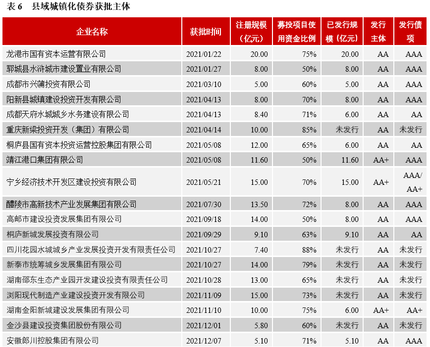 整體看,縣域城鎮(zhèn)化債券,發(fā)行主體不局限于示范縣,募投項目以重點產(chǎn)業(yè)為主。隨著“共同富裕”戰(zhàn)略的推進,發(fā)展重心從脫貧攻堅向鄉(xiāng)村振興,產(chǎn)業(yè)振興成為主要方式。2021年來,發(fā)改委已批準(zhǔn)有29家企業(yè)注冊縣域城鎮(zhèn)化債券,注冊規(guī)模超過310億元。其中,2021年12月來注冊加速,分別有6家和4家主體。2022年,本創(chuàng)新品種發(fā)行或加速。