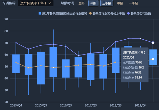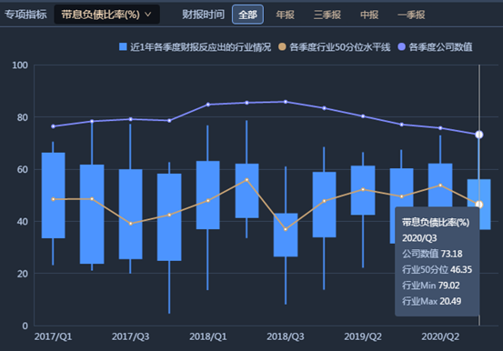 據(jù)年報(bào),2020年第三季,公司合并報(bào)表資產(chǎn)負(fù)債率為70.05%。報(bào)告中稱,報(bào)告期內(nèi),公司資產(chǎn)負(fù)債率較高,負(fù)債規(guī)模較大。雖然較高的杠桿率加快了公司的業(yè)務(wù)發(fā)展速度,但如果公司流動(dòng)性管理與負(fù)債情況不匹配,則在市場環(huán)境發(fā)生不利變化的情況下,公司面臨的財(cái)務(wù)風(fēng)險(xiǎn)隨之提高。如下圖,紫光集團(tuán)的歷年帶息負(fù)債比率遠(yuǎn)高于同行。另外,三季報(bào)中,公司帶息債務(wù)總額占公司總負(fù)債的73.18%。報(bào)告中稱,公司有息負(fù)債在報(bào)告期內(nèi)有所回落,但規(guī)模仍較大,在總負(fù)債中占比較高。未來公司償債壓力較大,需要大量流動(dòng)資金償還有息債務(wù)本息,如果公司經(jīng)營狀況出現(xiàn)下滑或者融資渠道減少的情況,可能導(dǎo)致債券償付受到不利影響。如下圖,紫光集團(tuán)的歷年帶息負(fù)債比率遠(yuǎn)高于同行。