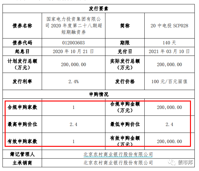 再來看看包銷發行的優質發行人發行場面,冷冷清清凄凄慘慘戚戚,發20億元,只有1個申購人,1個申購價位,1倍的全場倍數。