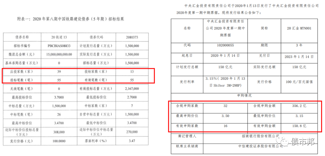 我們來看一下,堅持市場化發行的優質發行人——中國國家鐵路集團和中央匯金公司的發行結果公告,每次發行的有效申購家數都能超過10家。看著這數字,隔著屏幕都能感覺到鑼鼓喧天熱鬧非凡的發行場面。