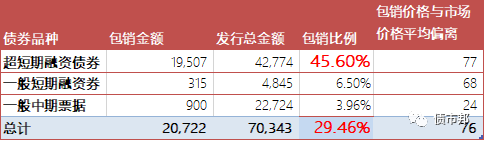 分品種看,超短期融資券為重災區,接近一半的發行金額均為包銷發行。