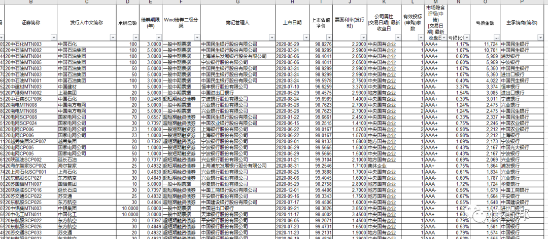 基于前文所說的的包銷券鑒定和包銷機會成本測算,阿邦篩選了2020年1月1日至12月10日的公開發行的NAMFII公司信用類債券的包銷券,進行了損益的統計分析。