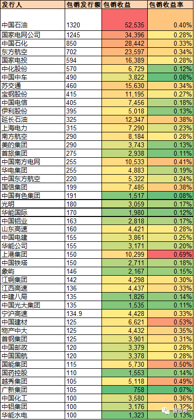 從包銷獲取的收益來看,沒錯,這里用的詞是收益,彼之砒霜吾之蜜糖,作為兩個博弈主體,主承付出的成本就是發行人獲取的收益。排名前五的發行人是中石油(52535萬)、國家電網(34396萬)、中石化(28442萬)、東方航空(23597萬)和國電投(16389萬)。