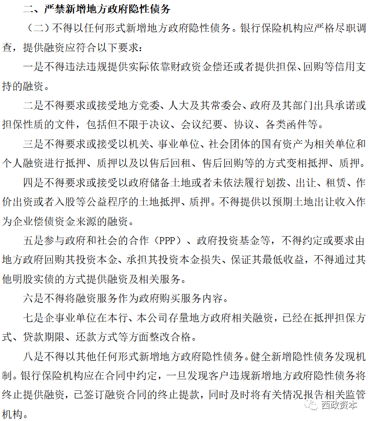 前文提到過,在城投債與城投非標(biāo)都面臨壓縮的大背景下,城投債受到的影響更加明顯(弱資質(zhì)城投發(fā)債已難以為繼),因此大部分城投平臺(tái)被壓縮的債券融資將更加依賴非標(biāo)融資的補(bǔ)充。需注意的是,在城投平臺(tái)的非標(biāo)融資業(yè)務(wù)中,目前比較難處理的是融資主體和融資產(chǎn)品架構(gòu)的問題,其中因城投平臺(tái)本身與地方政府有無法割裂的聯(lián)系,因此在融資層面如何確保城投平臺(tái)的融資不違反15號(hào)文是首先要解決的問題,以下再看看15號(hào)文中關(guān)于新增政府隱性債務(wù)的限制性規(guī)定: