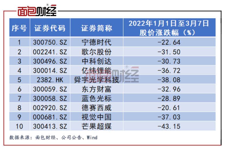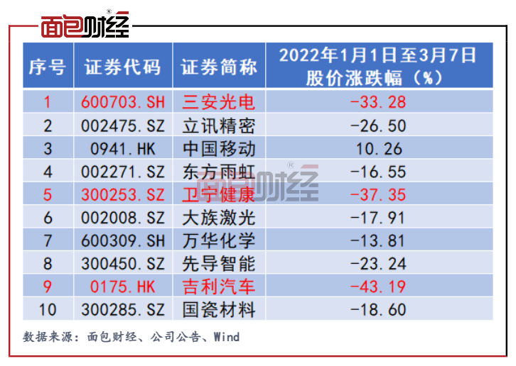 2022年初至3月7日收盤,三安光電股價一路下行,區間跌幅達33.28%。除了三安光電之外,睿遠成長價值A前十大重倉股中的吉利汽車今年以來跌幅達43.19%;衛寧健康跌幅達37.35%。
