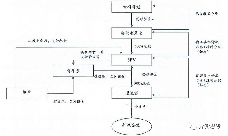 在搭建該類REITS結構前的既有結構中,青年樂為新派公寓的整租方和運營方,即青年樂與通達富簽署《整租協(xié)議》,并定期向通達富支付租金,青年樂再將新派公寓轉租給租客,賺取租金差價;在該交易結構中,由SPV、通達富、青年樂簽署三方《委托管理協(xié)議》,期限5年,約定SPV承接青年樂的職能,從通達富整租新派CBD物業(yè)并對外分租,原青年樂和通達富的總租關系終止。SPV委派青年樂提供租賃運營管理服務,包括但不限于確定金水平、催收、日常管理物業(yè)改造等安排,青年樂業(yè)績激勵費占當年SPV的分租租金和綜合配套收入之和的【5】%,且青年樂承諾從2018年起,SPV每年可分配凈現(xiàn)金流不低于【800】萬/年(扣除青年樂的業(yè)績激勵費之后);若SPV的可分配凈現(xiàn)金流不足上述標準的,青年樂承諾無條件不可撤銷地予以差額補足。