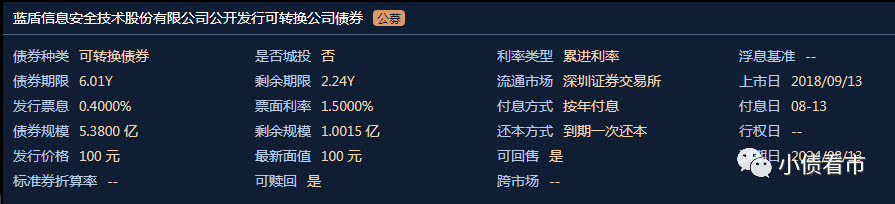 《小債看市》統計,目前藍盾股份僅存續“藍盾轉債”這一只可轉債,存續規模1億,轉股金額4.38億元,轉股價5.79元。