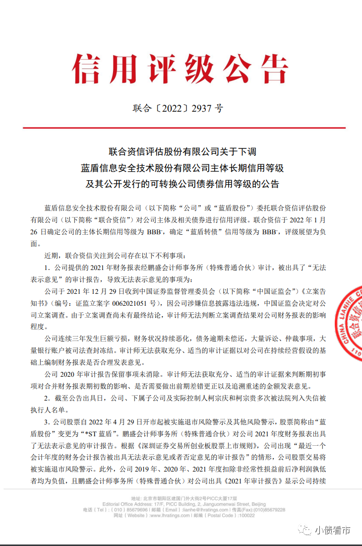 5月17日,聯合資信公告稱,下調藍盾股份(300297.SZ)主體長期信用等級為BB,同時下調“藍盾轉債”的信用等級為BB,評級展望為負面。