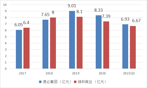 從總體營業收入情況來看,2020年,德必集團的營業收入為8.33億元,錦和商業為7.39億元,2021年第三季度德必集團營業收入為6.93億元,錦和商業為6.67億元。德必集團營業收入的增長率高于錦和商業。