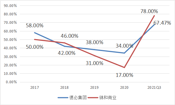 本質上來說,德必集團和錦和商業目前仍是“二房東”的中資產模式。從資產負債情況來看,2017年到2020年,德必集團與錦和商業的資產負債率均較低,維持在60%以下,且一直處于下降狀態。