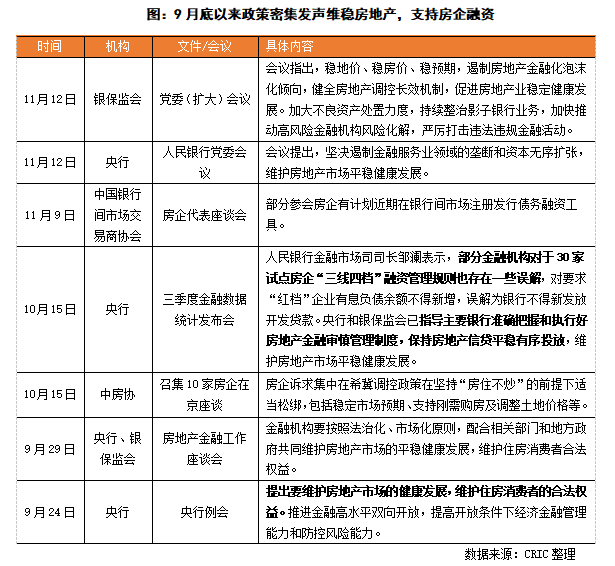 9月末央行首次提及“兩個維護”,指導銀行準確把握和執行好房地產金融審慎管理制度,保持房地產信貸平穩有序投放,維護房地產市場平穩健康發展。10月15日,中房協召集了10家房企在京座談,住建部相關部門人員參與主持,據透露,房企的主要訴求集中在希冀調控政策在堅持“房住不炒”的前提下適當松綁,包括穩定市場預期、支持剛需購房及調整土地價格等。此后,央行和銀保監會又多次提及促進房地產行業穩定健康發展。在此情況下,政策端風向有所緩和,從宏觀上對房地產信心重塑有所推進,維穩房地產。
