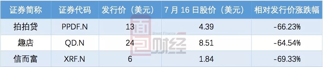 截至2018年7月16日,拍拍貸、趣店和信而富3家公司股價分別為4.39美元,8.51美元與1.84美元,相較發(fā)行價跌幅分別為66.23%,64.54%與69.33%。