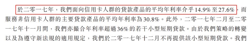 招股書顯示,2017年向信用卡人群的貸款產(chǎn)品平均年利率介乎14.9%到27.6%之間。