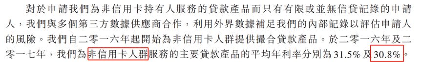 2016年和2017年,為“非信用卡人群服務(wù)的主要貸款產(chǎn)品的平均年化利率分別為31.5%及30.8%”。招股書原文如下:
