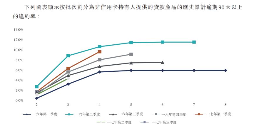 51信用卡招股書上提供的圖表上沒有標(biāo)注詳細(xì)的違約率數(shù)據(jù),只能從坐標(biāo)軸上大致看到其區(qū)間。