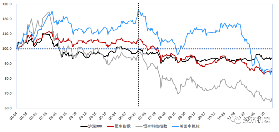 去年下半年以來,受房地產市場快速惡化和產業新政打擊,香港股市和中概股大幅下跌,跌幅顯著超過同期A股(圖7)。恒生科技指數和中概股去年最高下跌50%和40%,恒生指數高點跌幅達到26%。恒生指數目前PE約13倍,接近歷史上的底部區間。美國中概股估值接近歷史最低水平。