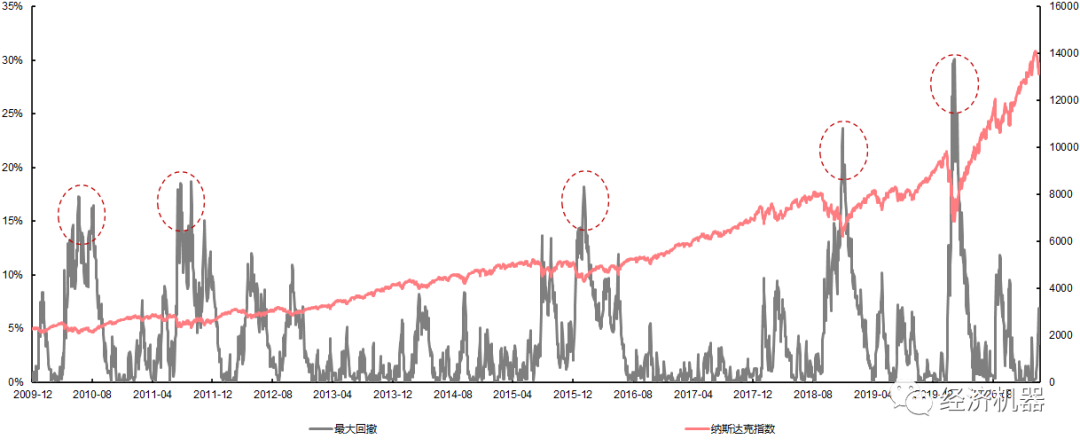 圖8、2009年以來,納斯達克指數回撤與走勢