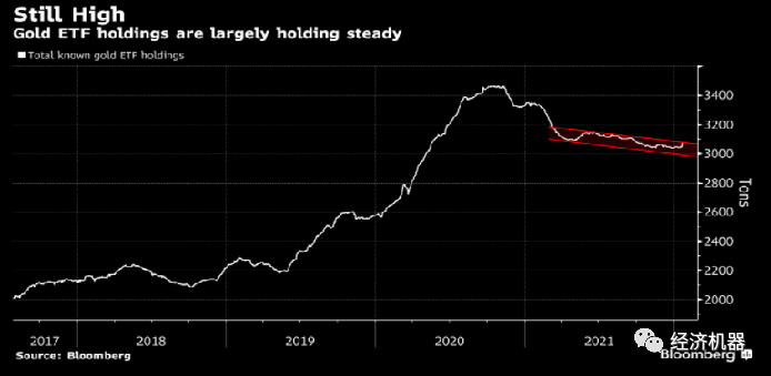 2021年COMEX黃金在美元加息預期下,全年下跌7.54%,幅度并不大。主要原因在于即便有加息預期,但美國國債收益率年內并未有大幅表現(圖15),而同期通貨膨脹率上升,12月CPI名義增速已經高達7%,美債實際利率持續處于深度負值區間。從黃金ETF持倉量來看(圖16),市場始終預判美聯儲難以將政策收緊到利率高于通脹的水平,持倉量并未大幅回落。