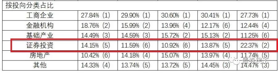 債券民工最關(guān)注的還是投向債券的信托規(guī)模。2021年度數(shù)據(jù)中,并未單獨(dú)披露投向債券的信托規(guī)模,只披露了投向證券投資的債券規(guī)數(shù)據(jù)。從這個(gè)數(shù)據(jù)也可以看出,2021年投向證券投資的占比大幅提升。