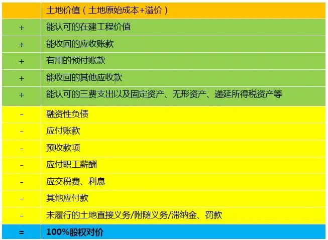 股權對價=土地價值(土地原始成本+溢價)+公司流動凈資產=凈資產+溢價