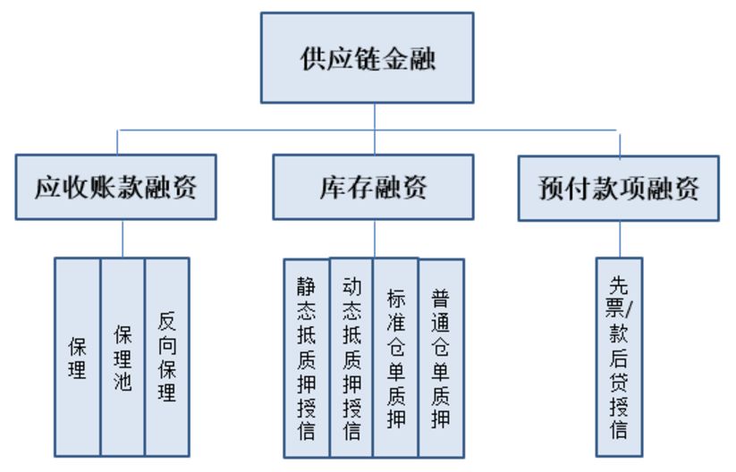我們知道企業的經營環節,主要是采購、生產和銷售環節,在這些環節中就必然會有上下游企業之分。在整個鏈條中,因為有的上下游企業資金緊張,從而導致供應商供不上貨,經銷商賣不出去庫存,從而形成大量的預付款或者應收款,以及產品庫存,整個鏈條的轉動變慢甚至停滯,影響到一些有一定市場地位的核心企業。那么圍繞這些大的核心企業,根據整個鏈條的轉動節點,設計出一些金融解決方案,幫產業鏈上的企業紓困解難。大體來說供應鏈金融主要有以下幾種模式。