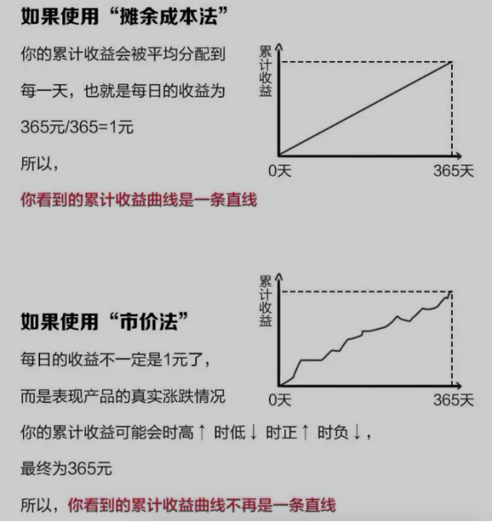 “攤余成本法”,對投資人來說算個過度階段吧,畢竟大家可能一下子接受不了理財產(chǎn)品出現(xiàn)明顯波動,而攤余成本計價的好處就是能抹平波動,投資者看到的每日收益相對穩(wěn)定一些。