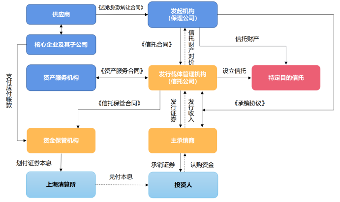 | 1、該等應收賬款債權系指基礎交易的賣方/承包人/出租人(以下簡稱“債權人”)與基礎交易的的買方/工程發包方/承租人(以下簡稱“債務人”)訂立的有關境內貨物貿易和服務貿易、工程建設、租賃等合同性法律文件,基礎交易的債權人對基礎交易的債務人享有的請求支付對應價款的權利。該應收賬款債權為整個資產支持票據的基礎債權。 (1)轉讓一手的情形,鐵建下屬成員單位作為基礎交易的債務人,與基礎交易的債權人發生貨物/服務貿易、工程承包、租賃業務等交易,對后者負有支付價款的義務,將該應付賬款在鐵建供應鏈金融服務平臺為其開具銀信。 (2)轉讓2-N手的情形,鐵建下屬成員單位對基礎交易的債權人負有應付賬款(該應付賬款金額與所開具銀信金額一致),并與基礎交易的債務人共同在中國鐵建供應鏈金融服務平臺上申請將該應付賬款以應付賬款-應收賬款債權的形式開具給基礎交易的債務人。基礎交易的債權人持有銀信后,將該銀信轉讓給基礎交易的債務人,作為貨物/服務貿易、工程承包、租賃業務等基礎交易的價款支付的對價。 3、銀信持有人將該銀信直接轉讓給鐵建保理申請融資,或轉讓給其他銀信受讓人,經過2-N手轉讓,最終持有銀信憑證的銀信持有人作為融資人,將其所持有的應收賬款債權轉讓給鐵建保理,并與鐵建保理簽署《銀信商業保理融資協議》,鐵建保理合法合規受讓該等應收賬款債權。 4、鐵建保理將該應收賬款債權信托/轉讓給上海信托設立中鐵建商業保理2018年度第一期銀信供應鏈資產支持票據信托并發行支持支持票據。 |