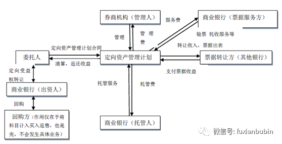 商業(yè)銀行理財資金或自有資金委托券商機構成立定向資產管理計劃,投資于銀行承兌匯票或商票,以到期承兌票款實現投資收益。這一業(yè)務設計主要是將票據資產從表內轉移到表外,擴大信貸規(guī)模。券商只是資管計劃的殼,銀行負責驗票和托收,已被127號文叫停。業(yè)務流程如下圖: