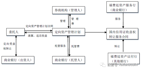 商業(yè)銀行理財資金或自有資金委托券商機構成立定向資產管理計劃,投資于信用證等福費廷資產。業(yè)務流程如下圖: