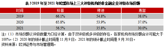 在歐盟市場上,截至2021年9月30日三大評級機構在非金融企業評級領域的市場份額出現不同程度的下滑,這可能主要是應對英國脫歐而進行業務運營調整導致的。另外,根據ESMA在市場份額計算報告中披露的信息,2021年惠譽市場份額(30.0%)中有相當一部分屬于非委托評級,如果僅考慮委托評級的話,惠譽與標普、穆迪的市場份額差距可能更大。