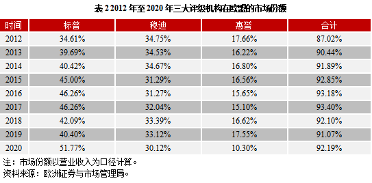對于標普而言,旗下的S&P Global Ratings Europe Limited于2018年5月1日合并了S&P Global Ratings Italy S.r.l.,于2018年6月30日合并了Standard and Poor’s Credit Market Services Europe Limited,于2018年7月31日合并了S&P Global Ratings France S.A.S.。所以,2019年納入市場份額計算的標普旗下機構僅為S&P Global Ratings Europe Limited,該機構是一家總部位于都柏林的愛爾蘭公司。