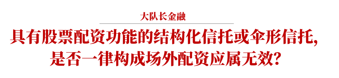 根據(jù)2019年11月發(fā)布的《全國(guó)法院民商事審判工作座談會(huì)紀(jì)要》(以下簡(jiǎn)稱《九民紀(jì)要》)第86條的規(guī)定,場(chǎng)外配資合同無(wú)效。最高人民法院民事審判第二庭在其編著的《全國(guó)法院民商事審判工作會(huì)議紀(jì)要理解與適用》一書中認(rèn)為:“單一資金信托業(yè)務(wù)屬于信托公司正規(guī)的證券投資信托方式,也稱陽(yáng)光私募,其投資收益和風(fēng)險(xiǎn)不分層,依法成立的單一資金信托合同應(yīng)屬有效。對(duì)于在本輪股市劇烈波動(dòng)中引發(fā)巨大爭(zhēng)議的結(jié)構(gòu)化信托和傘形信托合同效力問(wèn)題,我們認(rèn)為,對(duì)于具有股票配資功能的結(jié)構(gòu)化信托和傘形信托,應(yīng)當(dāng)認(rèn)定為場(chǎng)外配資合同,在信托公司未取得融資融券國(guó)家特許經(jīng)營(yíng)許可的情況下,應(yīng)當(dāng)認(rèn)定合同無(wú)效。”[1]