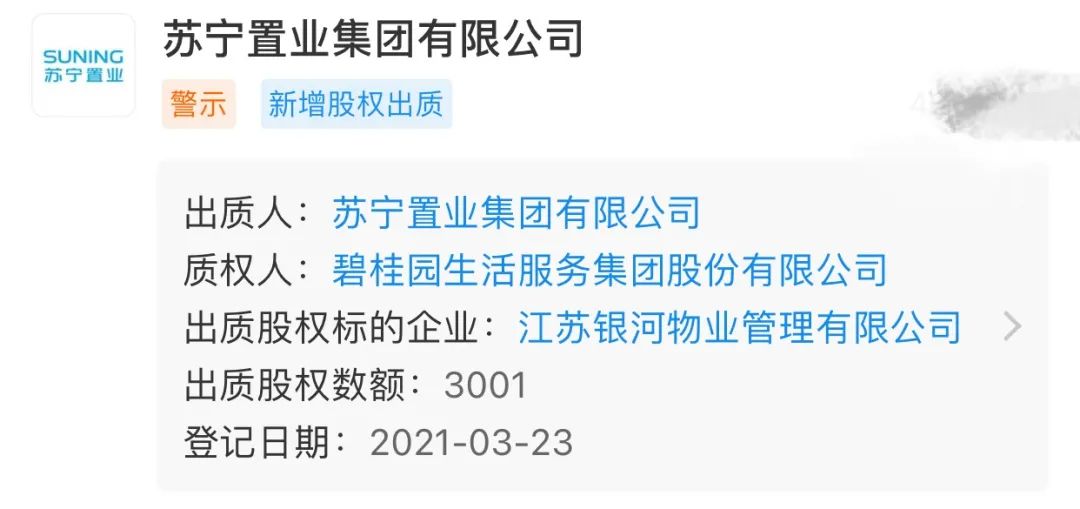最新資料顯示,蘇寧置業將其所持江蘇銀行物業管理有限公司的全部股份,質押給了碧桂園生活服務集團,后者是碧桂園服務(06098.HK)在內地的主要運營平臺公司。